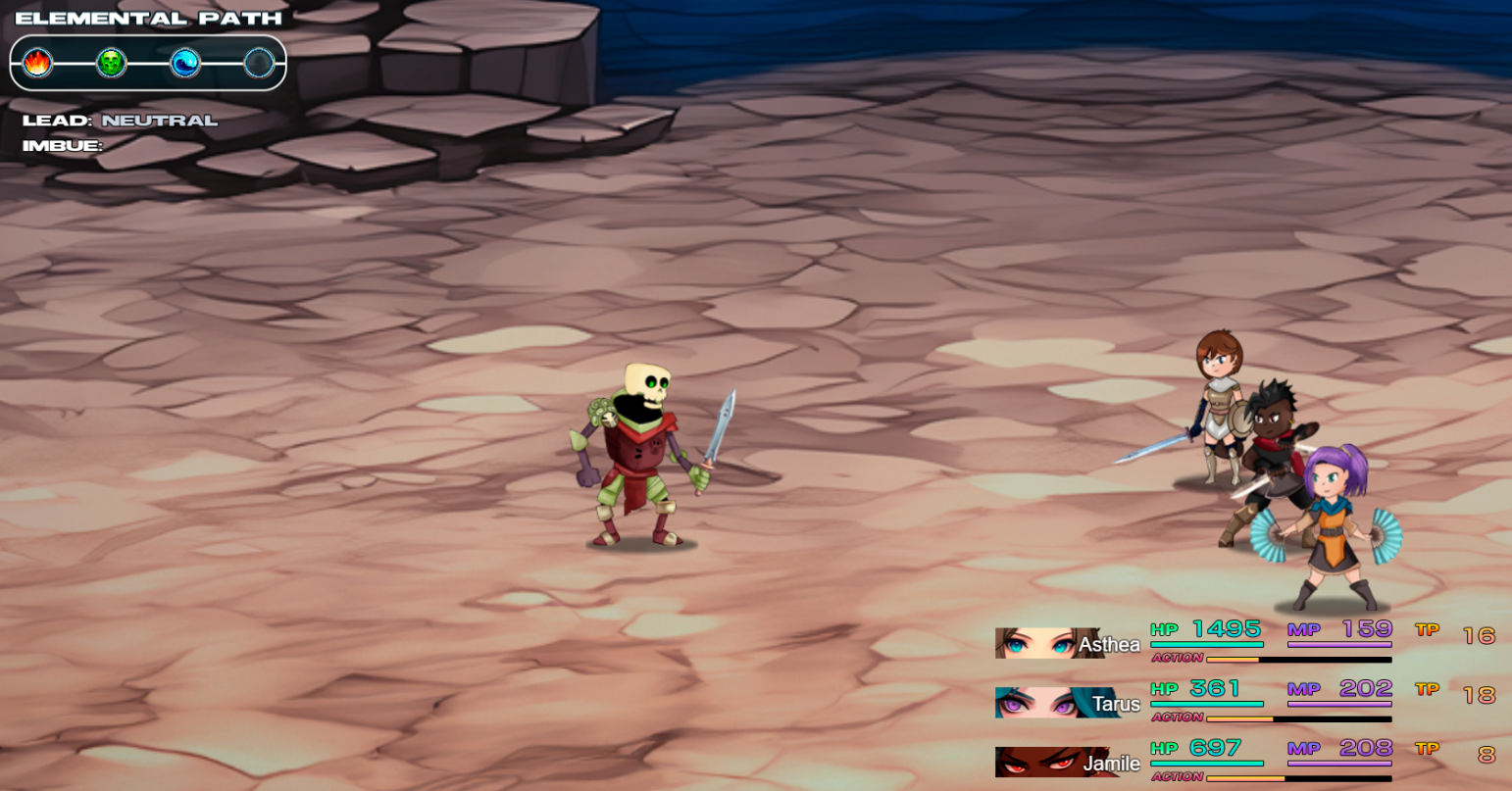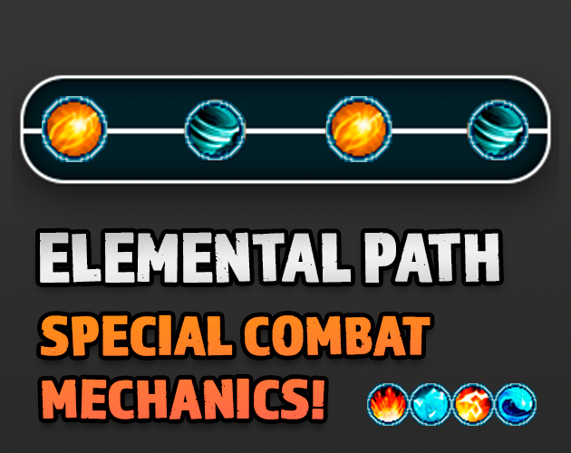 Elemental Path is a battle mechanic that tracks a 4-slot history of elements used (e.g., Fire → Fire → Ice → Ice). If any element appears in 2+ slots (Neutral ignored), it becomes LEAD; SUBDUE is its configured opposite. Actions auto-paint elements into the path, and the Rules plugin converts the current path into transparent bonuses/penalties (with multi-element support), while the HUD shows the state in real time so players instantly understand why their numbers changed.